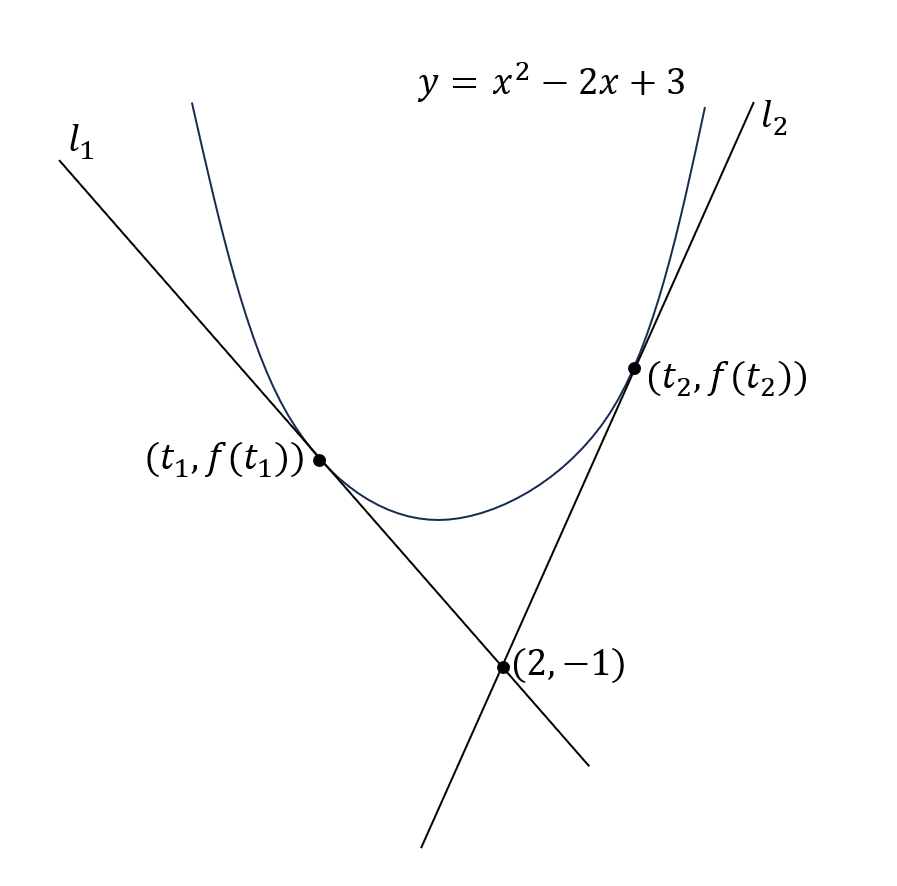 이번에는 미분을 사용하는 방법입니다. 접점의 좌표는 $(t, f(t))$이라고 한다면 접선의 기울기는 $f '(t)$입니다. 그러면 접선의 식은 $y=f '(t)(x-t)+f(t)$ 가 되고 이 식은 $(m,n)$을 지나기 때문에 대입을 해도 됩니다. 그래서 대입하여 나온 $n=f '(t)(m-t)+f(t)$ 은 $t$에 대한 이차방정식이므로 $t$의 값을 구할 수 있습니다. 나온 각각의 $t$의 값을 $y=f(x)$에 대입하면 접점의 좌표가 바로 나오게 됩니다.