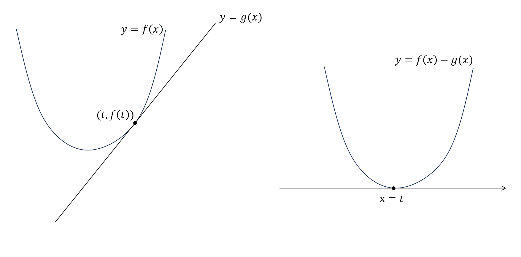 먼저 이 방법의 원리에 대해 알아보겠습니다. 먼저 이차함수 $y=f(x)$와 이 함수 위의 점$(t, f(t))$에서의 접선을 $y=g(x)$라고 하겠습니다.