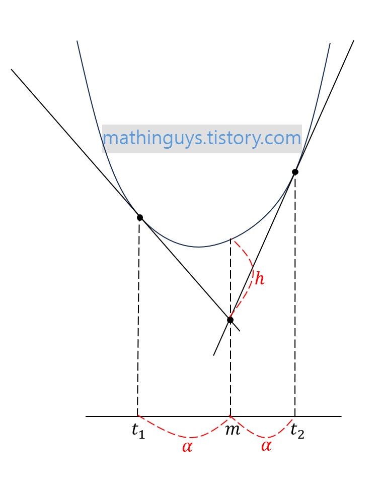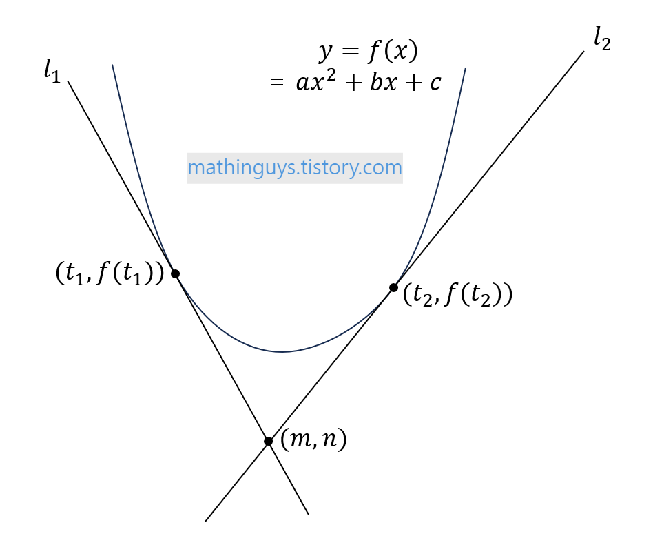먼저 미분을 배우지 않았다는 전제하에 사용하는 방법입니다. 먼저 $(m,n)$을 지나며 이차함수 $y=f(x)$에 접하는 직선의 기울기를 $k$라고 합니다. 그러면 접선의 식은 $y=k(x-m)+n$ 로 나타낼 수 있습니다.