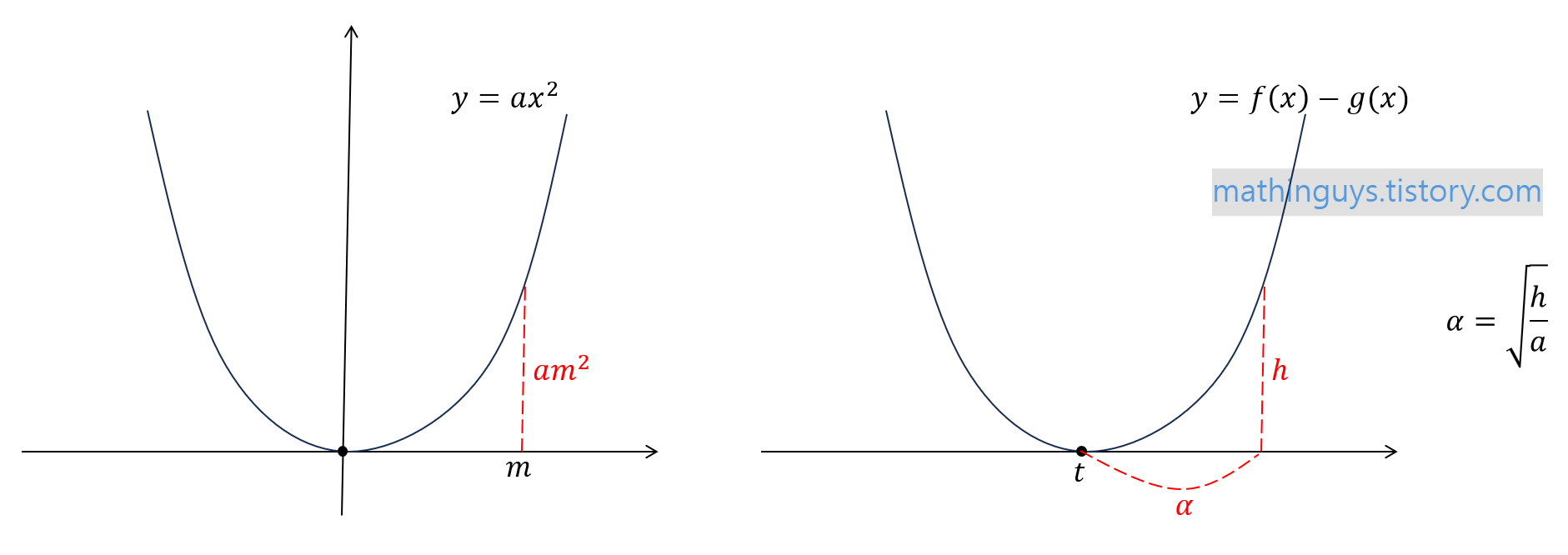 잠깐 기본적인 이차함수인 $y=ax^2$을 참고하면 (아래 왼쪽그림)